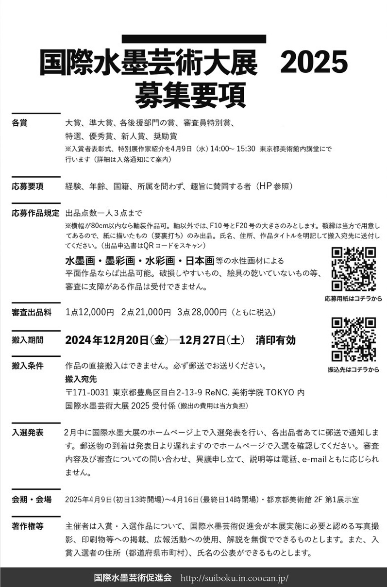 東京都美術館で来年2025年4月に開催される国際水墨芸術大展の公募のご案内です。募集要項は月刊美術12月号の61ページに掲載されています。